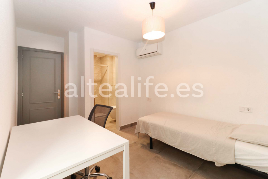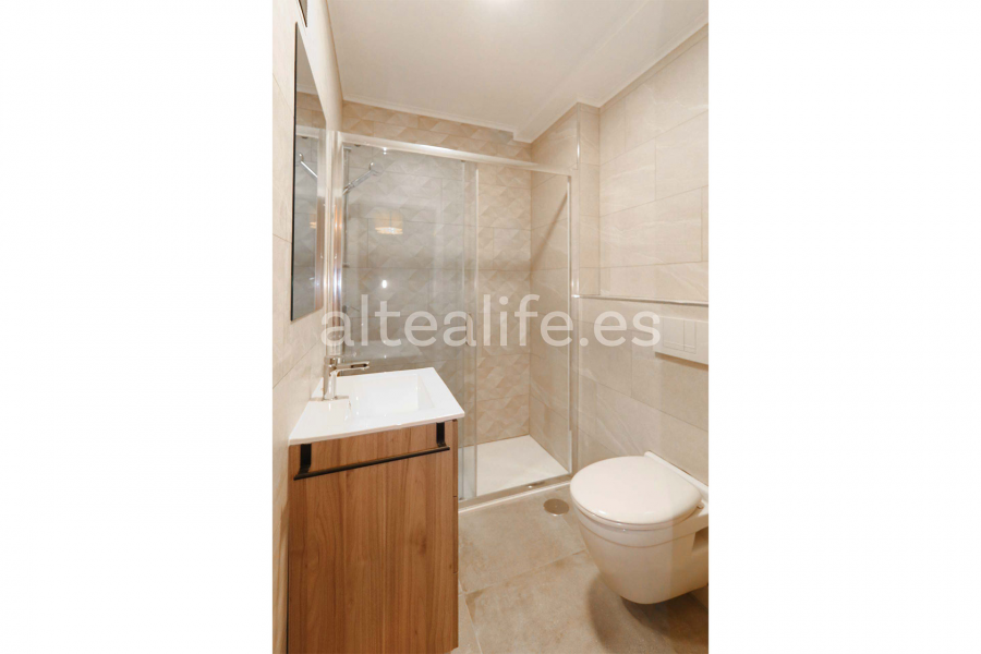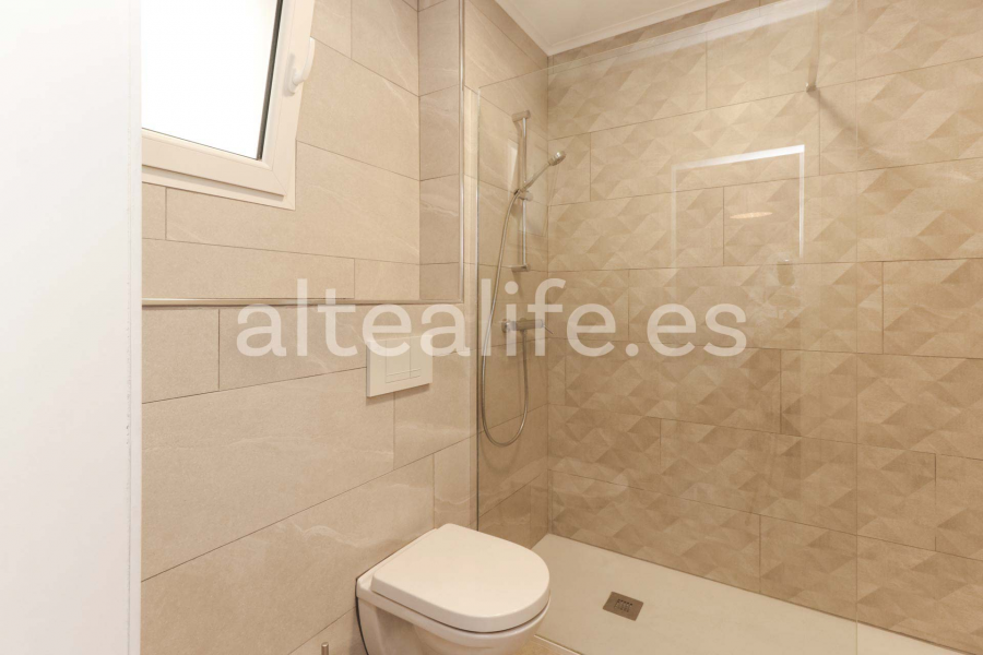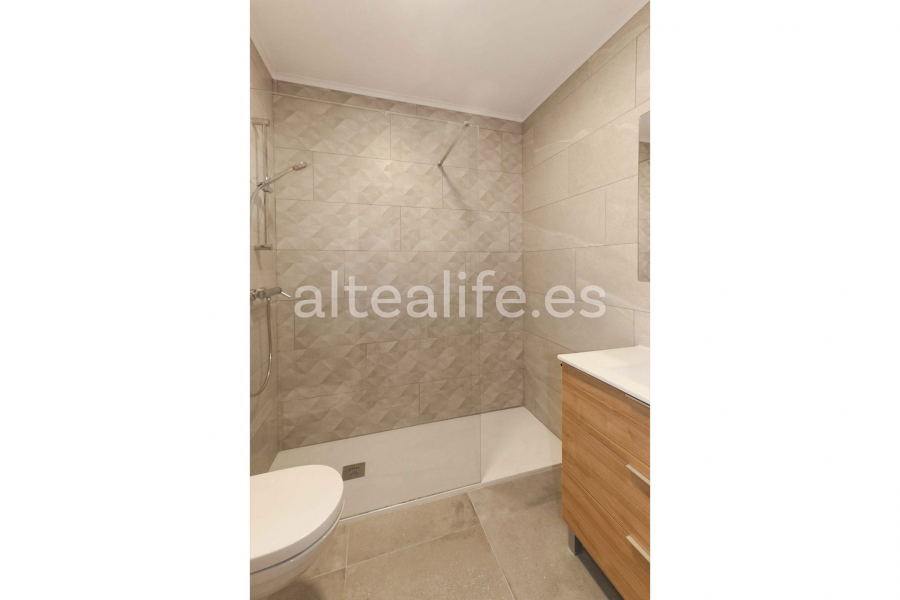 Los dormitorios ofrecen un ambiente tranquilo y cómodo, uno de ellos adaptado también como despacho o habitación polivalente, ideal para teletrabajo. Los baños, completamente renovados, cuentan con platos de ducha amplios, mamparas de cristal y acabados actuales que refuerzan la sensación de calidad. El apartamento está equipado con aire acondicionado, se encuentra en perfecto estado y forma parte de un edificio con ascensor. Su orientación noroeste garantiza una iluminación agradable y una temperatura equilibrada durante todo el año. Una excelente oportunidad para comprar apartamento en Altea, tanto como residencia habitual como inversión.