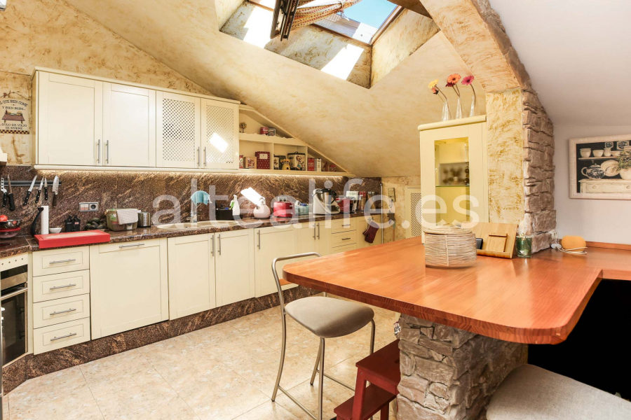 En su interior, el ático presenta un diseño cálido y acogedor, acompañado de elementos arquitectónicos singulares como paredes revestidas en piedra natural, columnas decorativas y techos inclinados que añaden carácter. La amplia zona de concepto abierto, donde se fusionan salón, comedor y cocina, se convierte en un espacio ideal para convivir y disfrutar de reuniones. La terraza, con diferentes ambientes exteriores, permite crear zona de relax, comedor de verano y área de tumbonas para aprovechar su orientación sureste y el sol durante todo el día.