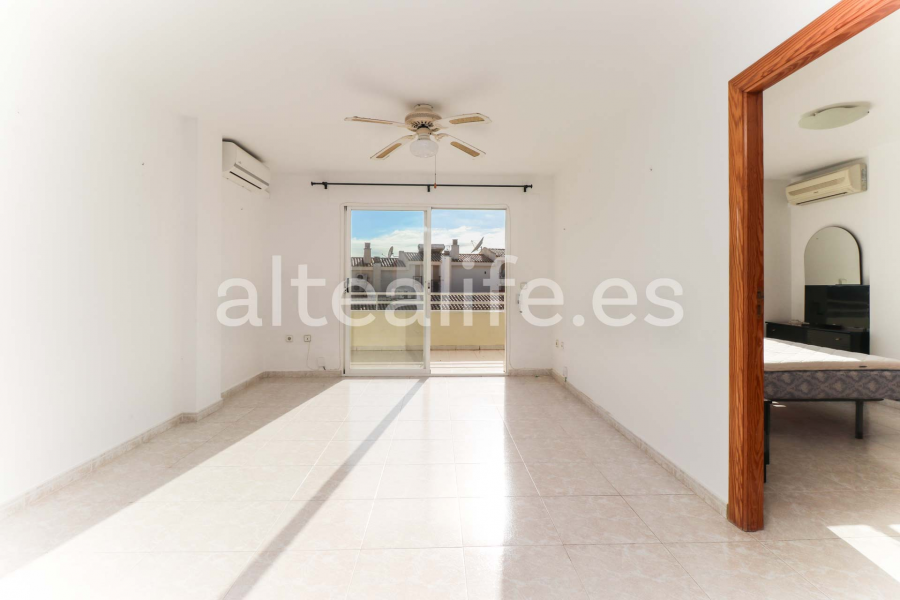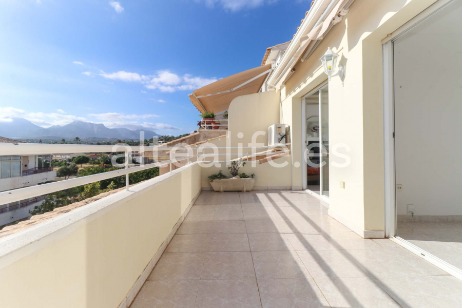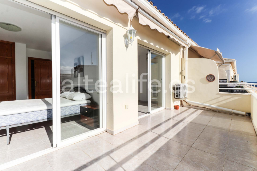 El ático cuenta con una amplia terraza privada que amplía el salón hacia el exterior, creando un ambiente perfecto para disfrutar del clima mediterráneo durante todo el año. Desde aquí se pueden apreciar vistas laterales al mar, al Puerto de Altea y a las montañas, un escenario ideal para relajarse, compartir comidas al aire libre o simplemente contemplar el atardecer.