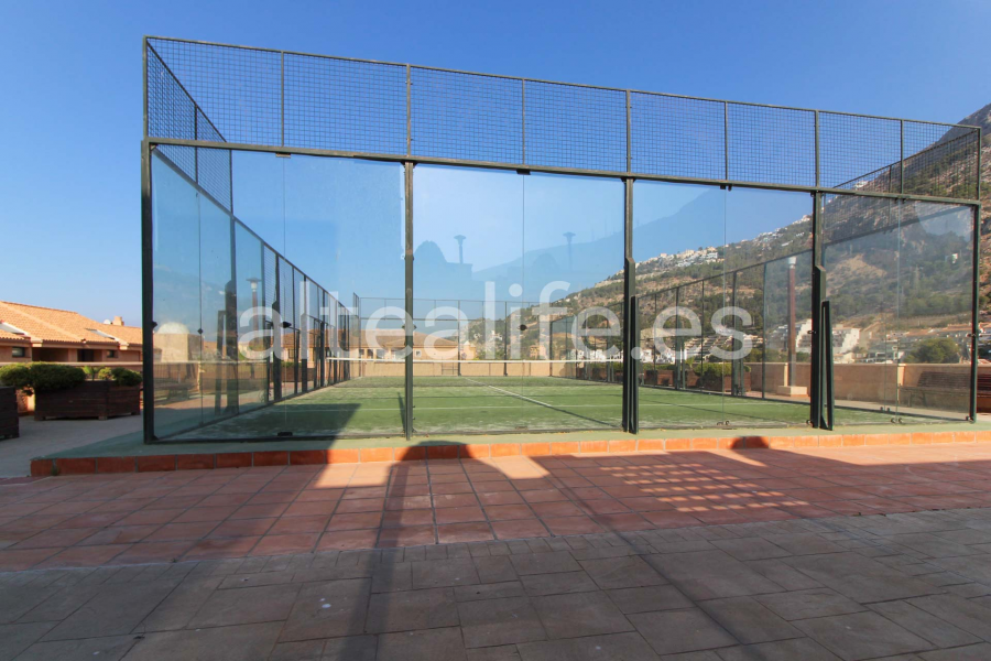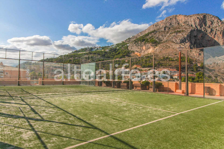 gran piscina comunitaria con vistas a la montaña, amplias zonas de descanso, pista de tenis y gimnasio, configurando un entorno perfecto tanto para vacaciones como para larga estancia.