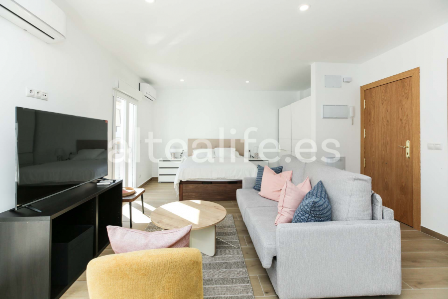 El estudio ha sido reformado con materiales de calidad, combinando líneas minimalistas y tonos neutros que transmiten amplitud y bienestar. Cuenta con aire acondicionado frío/calor, armarios empotrados y una excelente orientación este, que garantiza luz natural durante toda la mañana.