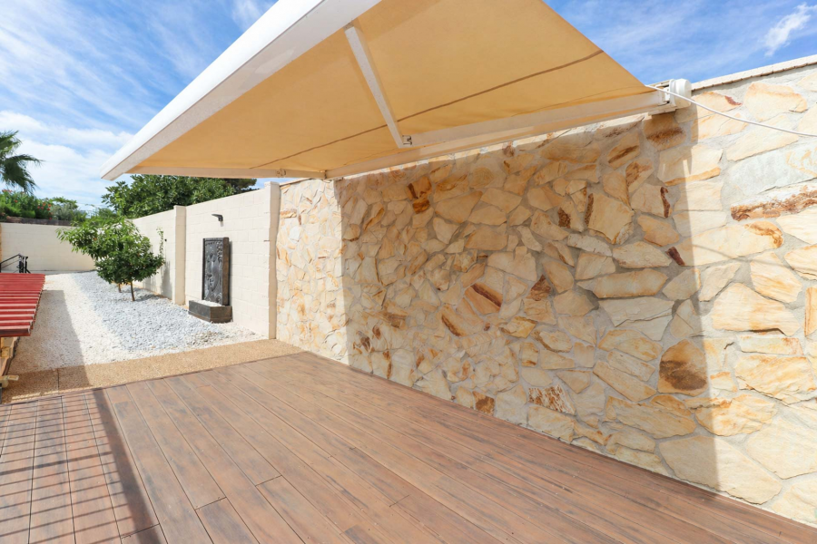 En el exterior, la villa sorprende con múltiples espacios pensados para el disfrute. Una gran terraza cubierta con toldos retráctiles conecta directamente con el interior y se convierte en el verdadero corazón social de la casa. Está distribuida en zona chill out con mobiliario exterior, y comedor de verano, perfecto para celebraciones familiares o comidas al aire libre.