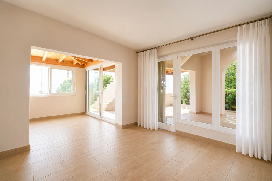 • Gran porche cerrado con ventanales de suelo a techo, con vistas al jardín y la piscina, que actúa como un segundo salón ideal para todo el año.