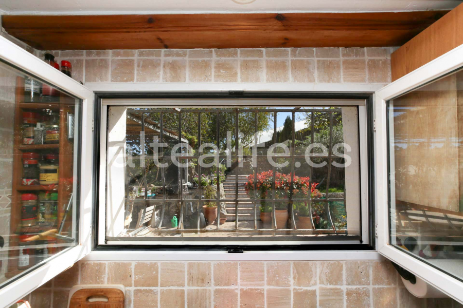 El exterior es uno de los grandes protagonistas de esta propiedad en venta en Altea. La casa dispone de dos amplias terrazas, una de ellas cubierta con una preciosa pérgola de hierro con cañizo natural, creando un espacio sombreado perfecto para comidas y reuniones al aire libre. La conexión directa desde los salones potencia la sensación de amplitud y vida exterior durante todo el año.