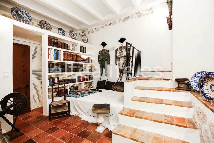 Amplio garaje privado, un auténtico lujo en el casco antiguo de Altea, con acceso independiente desde otra calle. En esta planta también encontramos una acogedora sala polivalente, actualmente utilizada como salón de lectura, con librerías integradas y gran capacidad de almacenaje, ideal como despacho, zona de ocio o estudio. - Primera planta: