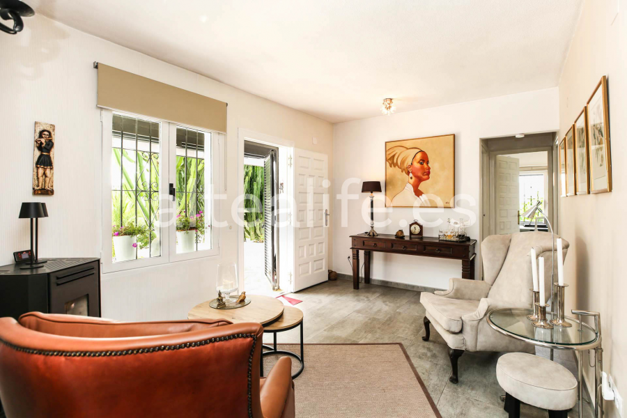 La vivienda, de 127 m² construidos sobre una parcela de 873 m², destaca por su arquitectura tradicional mediterránea con fachada blanca, arcos y teja árabe, perfectamente integrada en un cuidado jardín con vegetación autóctona y zonas de descanso. Las imágenes reflejan un hogar muy luminoso, con amplios ventanales, materiales cálidos y espacios pensados para disfrutar durante todo el año.