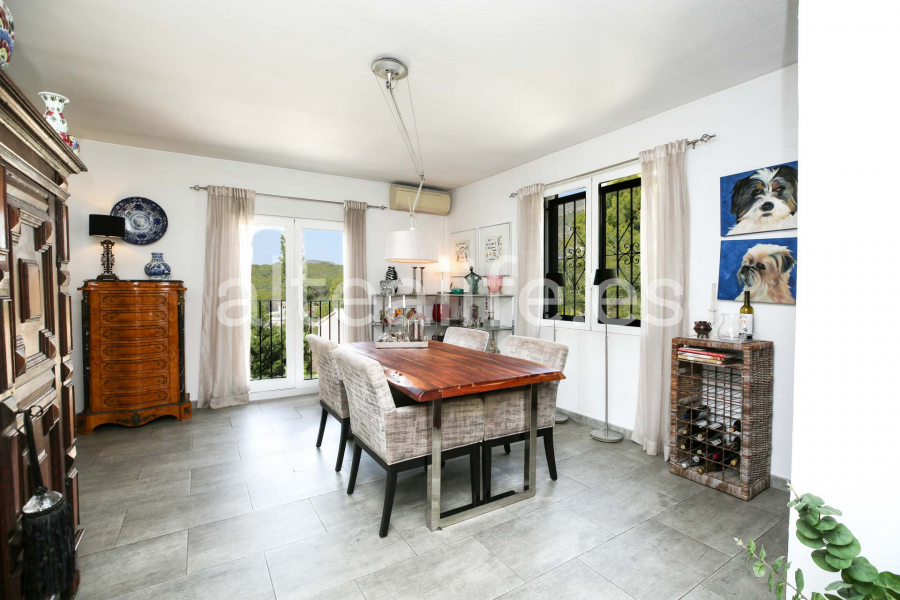 La distribución sin apenas puertas entre zonas comunes aporta una sensación de amplitud, continuidad y confort, manteniendo a la vez la diferenciación de espacios. La villa está equipada con aire acondicionado, estufa de pellets en la entrada y chimenea de leña en el salón, garantizando confort durante todo el año.