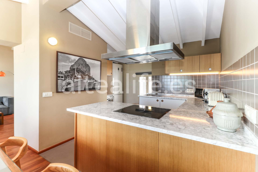 Destacan los techos altos con vigas vistas pintadas en blanco, los muros originales de piedra natural, suelos combinados de madera y hormigón pulido, y amplios ventanales que enmarcan unas impresionantes vistas panorámicas al mar y al casco antiguo de Altea. La vivienda goza de orientación Sureste, garantizando luminosidad natural durante todo el día.