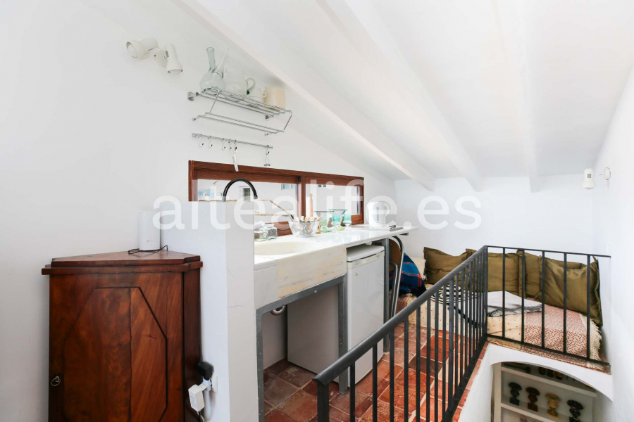 Espacio de concepto abierto que actúa como corazón de la vivienda. Dispone de recibidor, una cocina moderna totalmente equipada con zona de trabajo funcional, y un un elegante salón comedor con chimenea y grandes ventanales que recorren la estancia, ofreciendo impresionantes vistas al mar y al casco antiguo. Esta planta se completa con un aseo de cortesía. La arquitectura con arcos y los suelos de barro aportan un encanto especial. - Segunda planta: